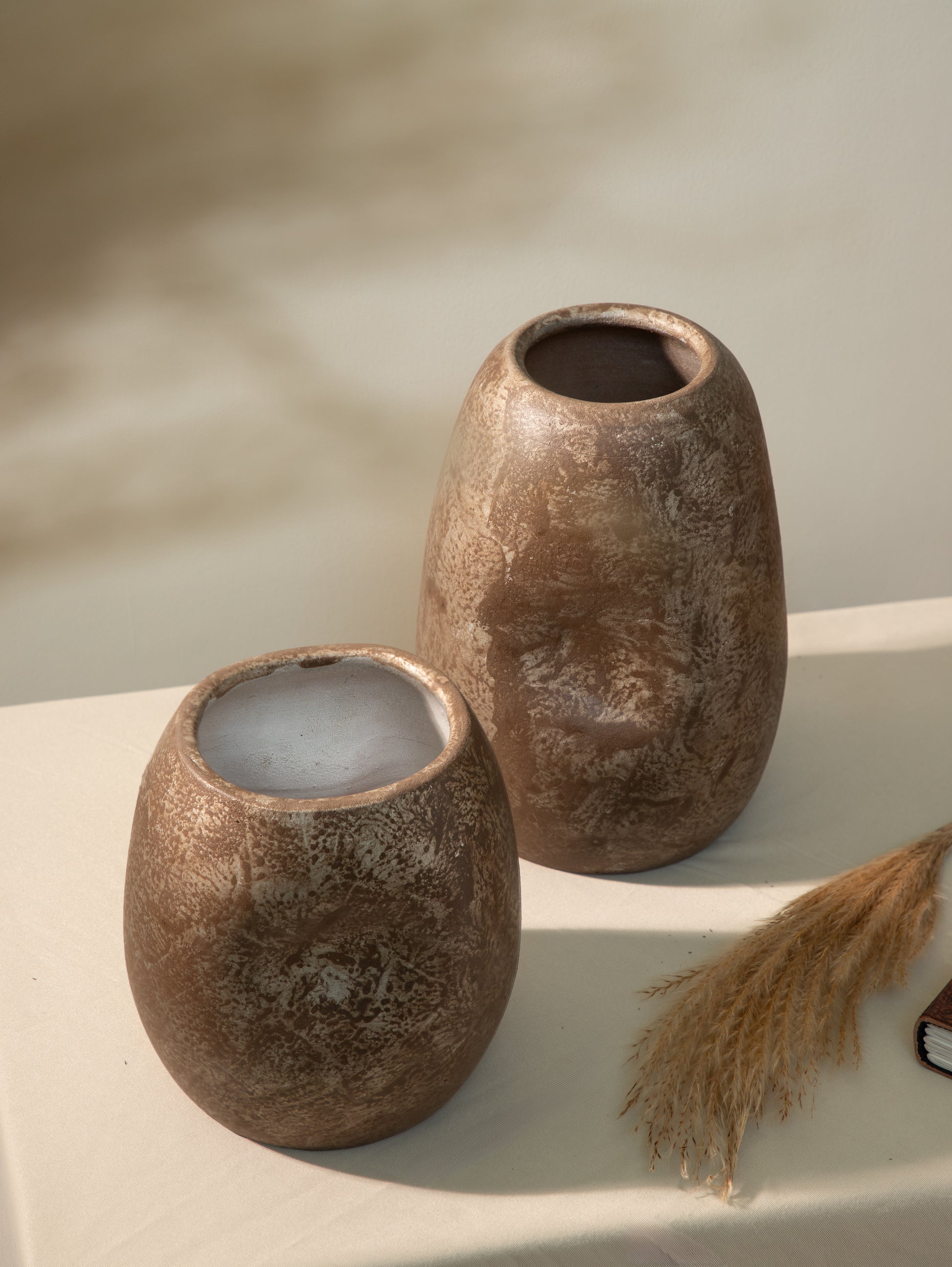 The finishes vary in character and mood: soft matte surfaces that absorb light quietly, burnished and metallic tones that reflect it with warmth, and textured treatments that invite touch and closer inspection. Subtle irregularities, born from hand processes, are not concealed but celebrated, lending each vase a sense of individuality and quiet depth.