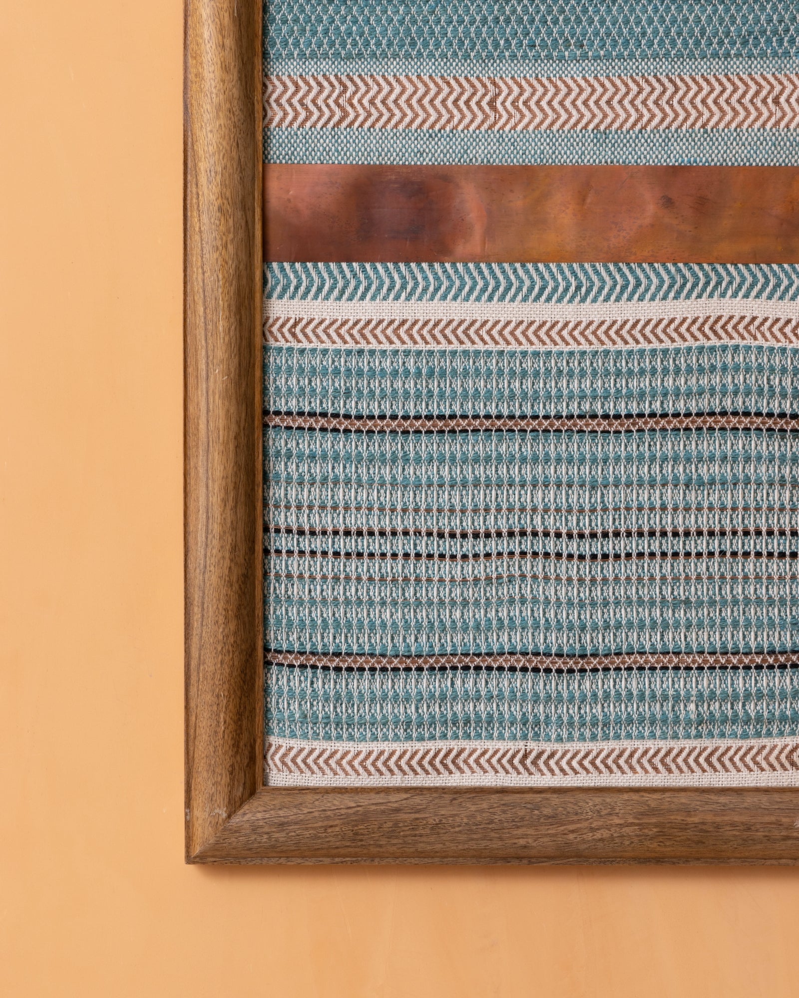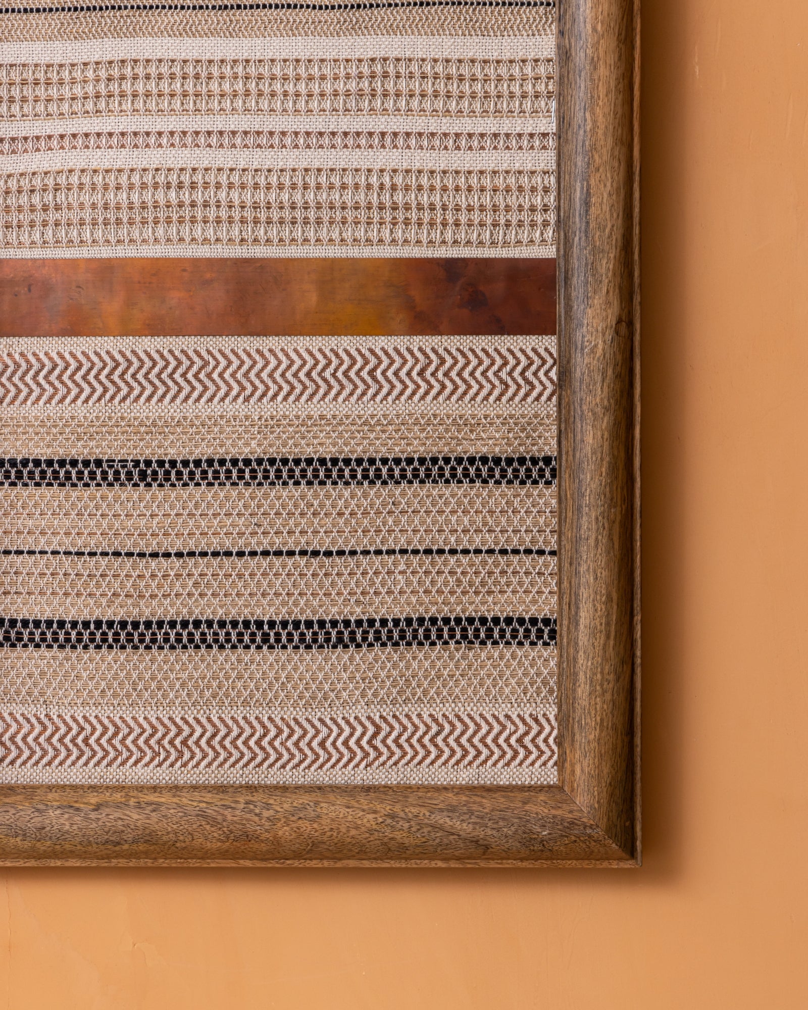Handwoven copper wires blend seamlessly with soft cotton threads, creating a textured landscape that reflects balance and depth.