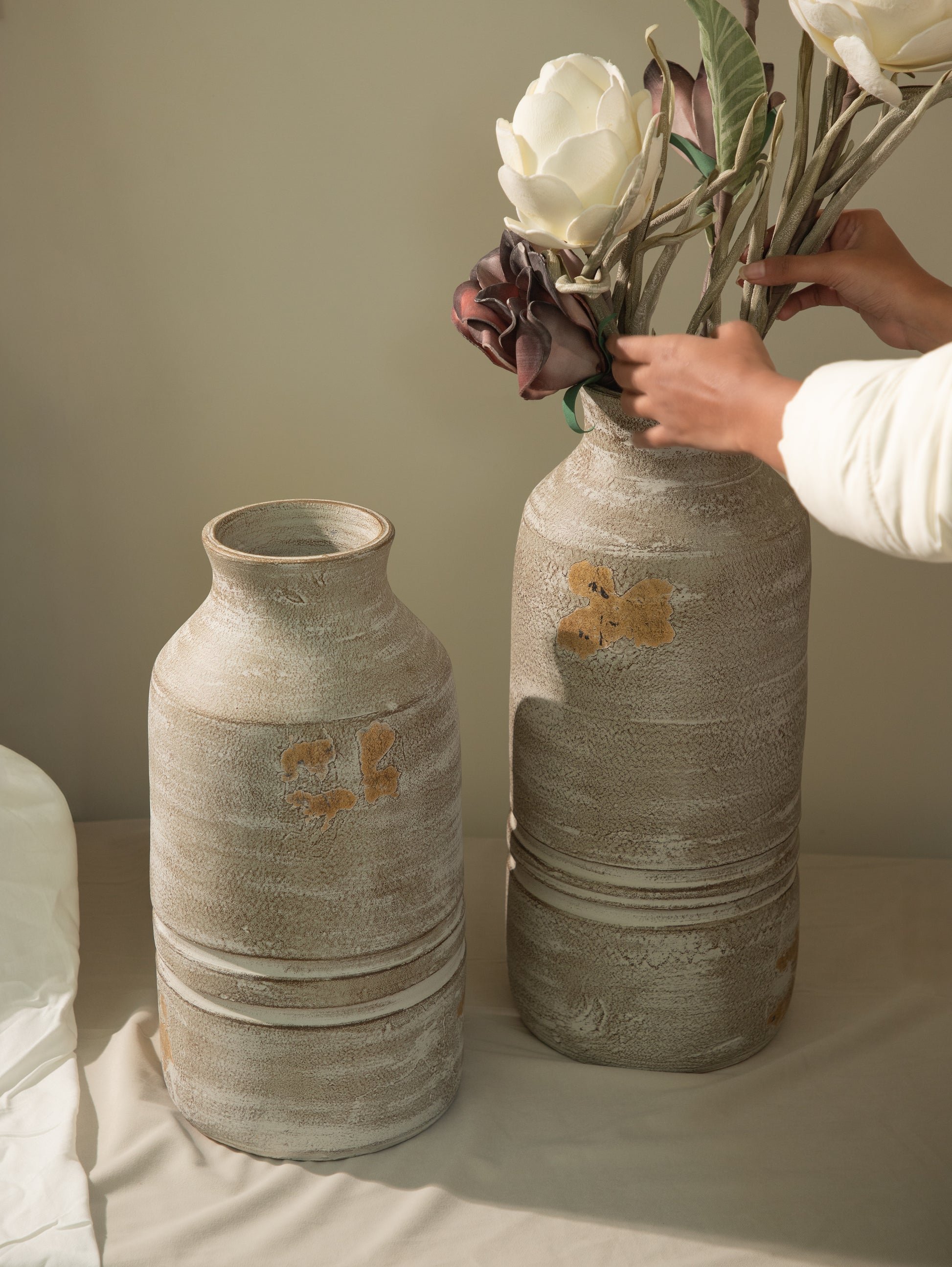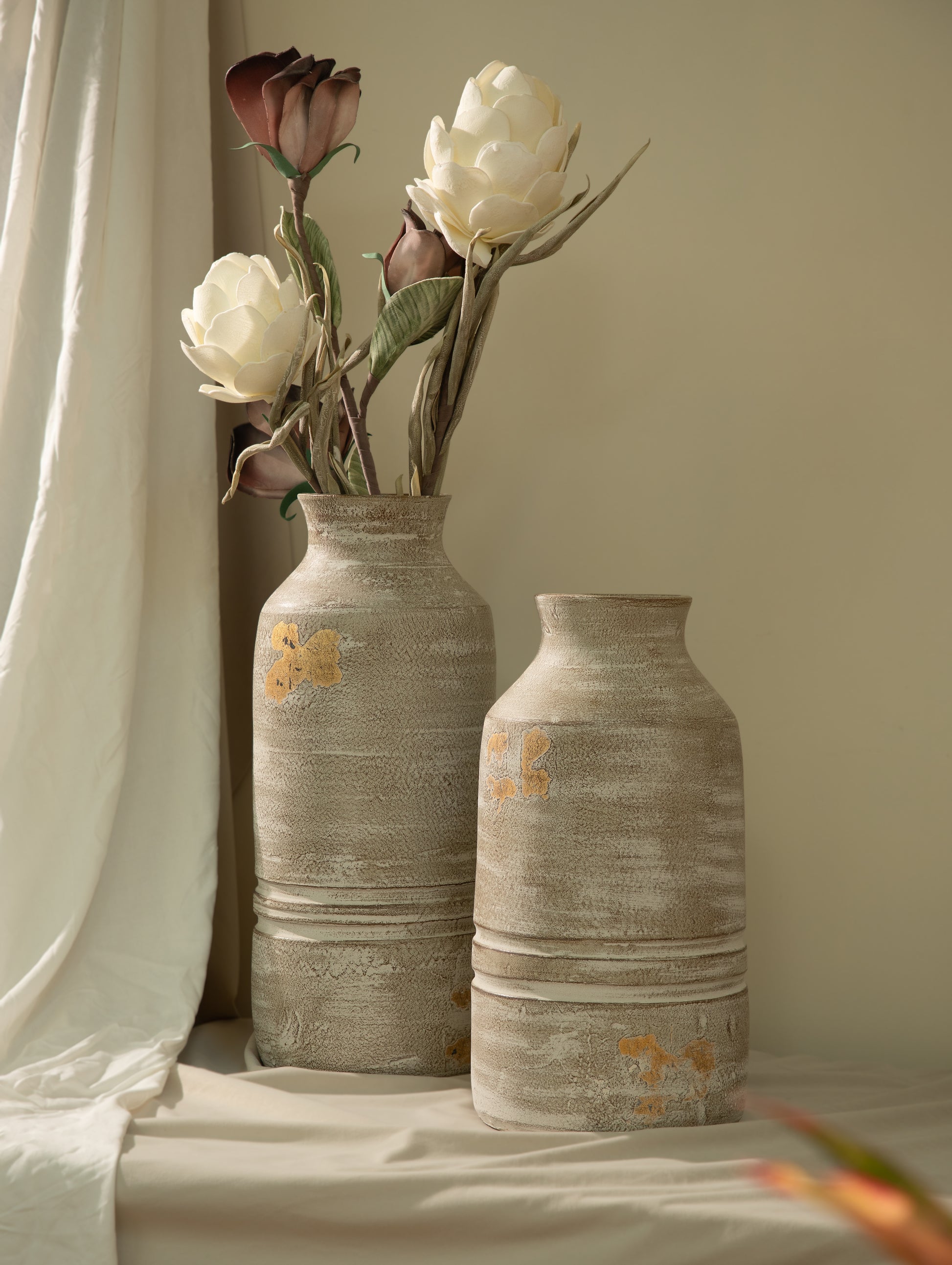 The finishes vary in character and mood: soft matte surfaces that absorb light quietly, burnished and metallic tones that reflect it with warmth, and textured treatments that invite touch and closer inspection. Subtle irregularities, born from hand processes, are not concealed but celebrated, lending each vase a sense of individuality and quiet depth.