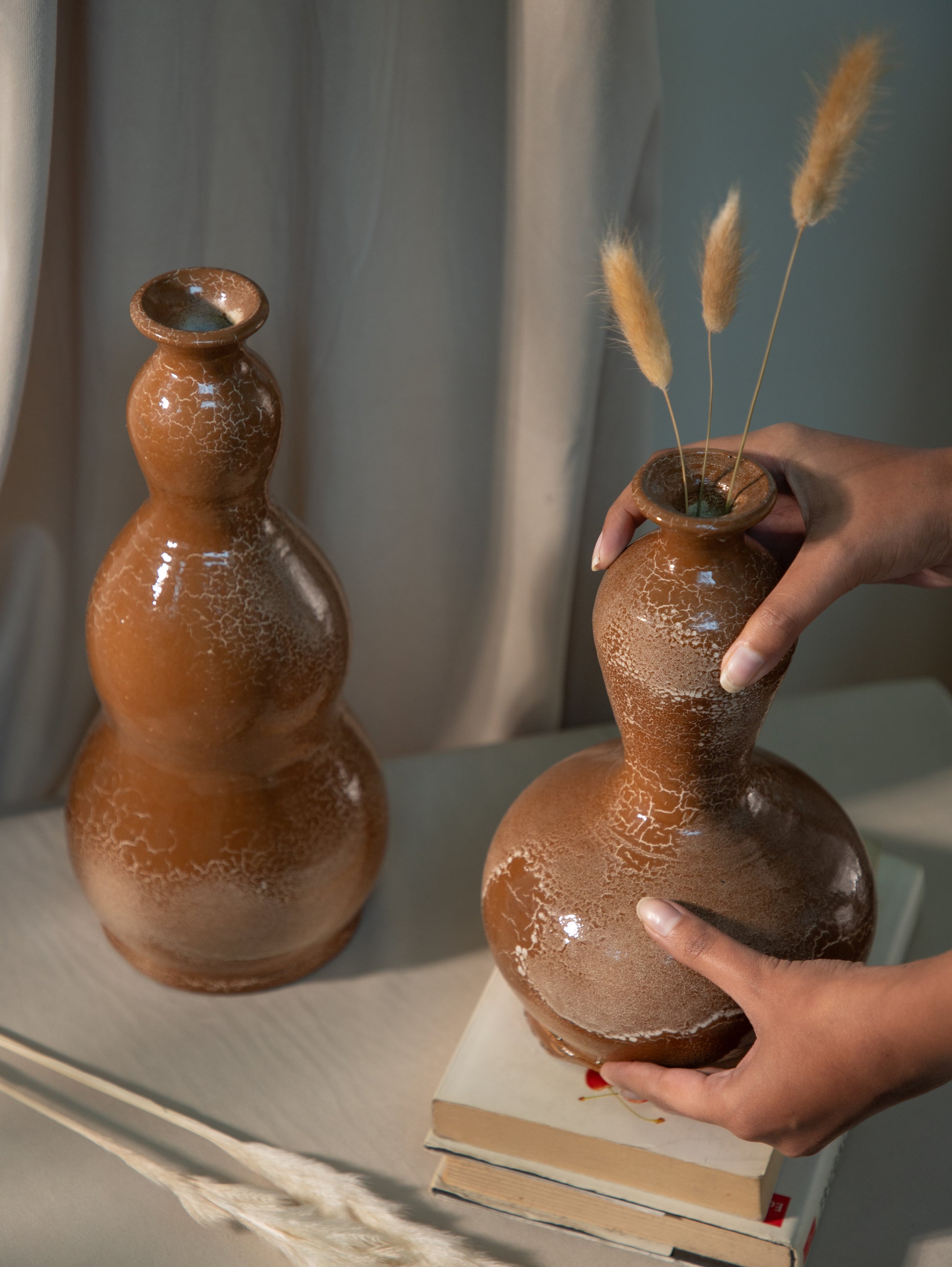 The finishes vary in character and mood: soft matte surfaces that absorb light quietly, burnished and metallic tones that reflect it with warmth, and textured treatments that invite touch and closer inspection. Subtle irregularities, born from hand processes, are not concealed but celebrated, lending each vase a sense of individuality and quiet depth.