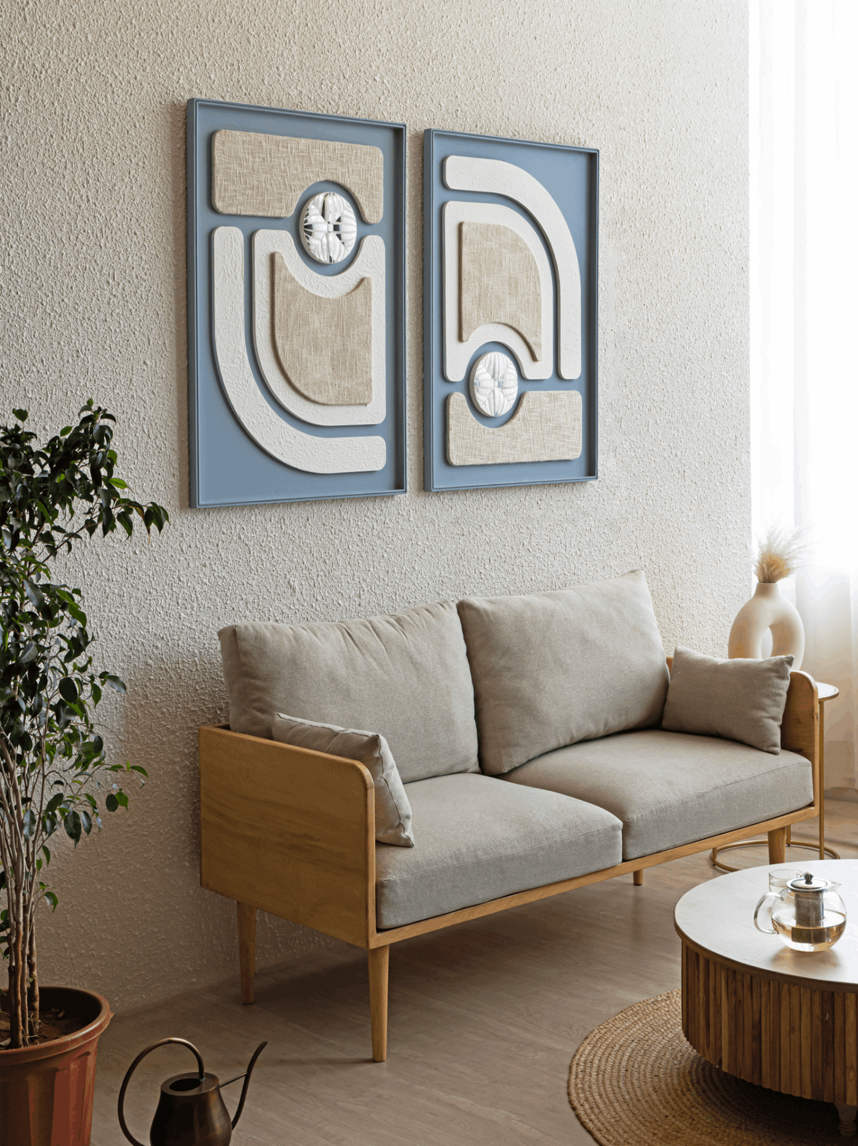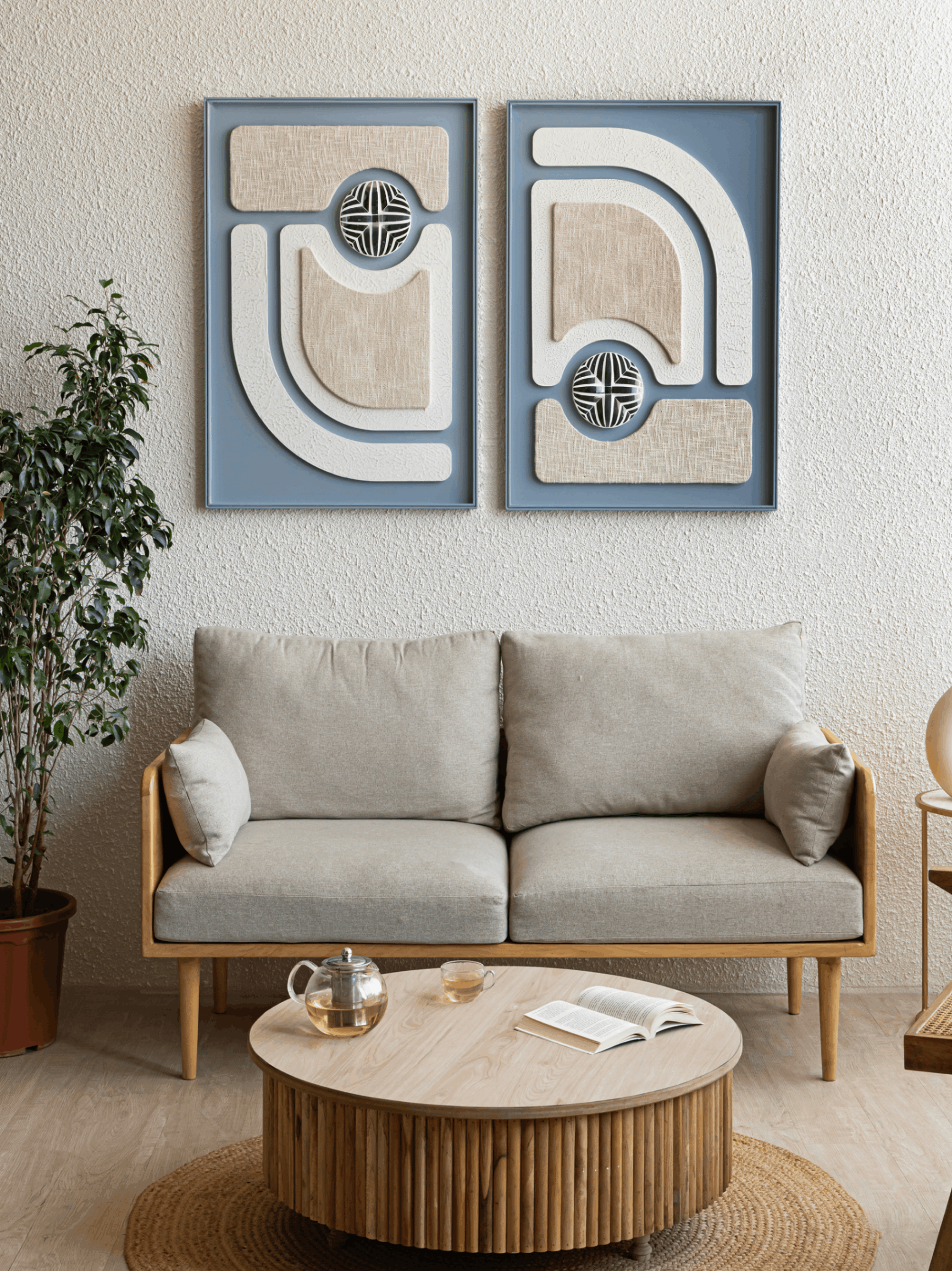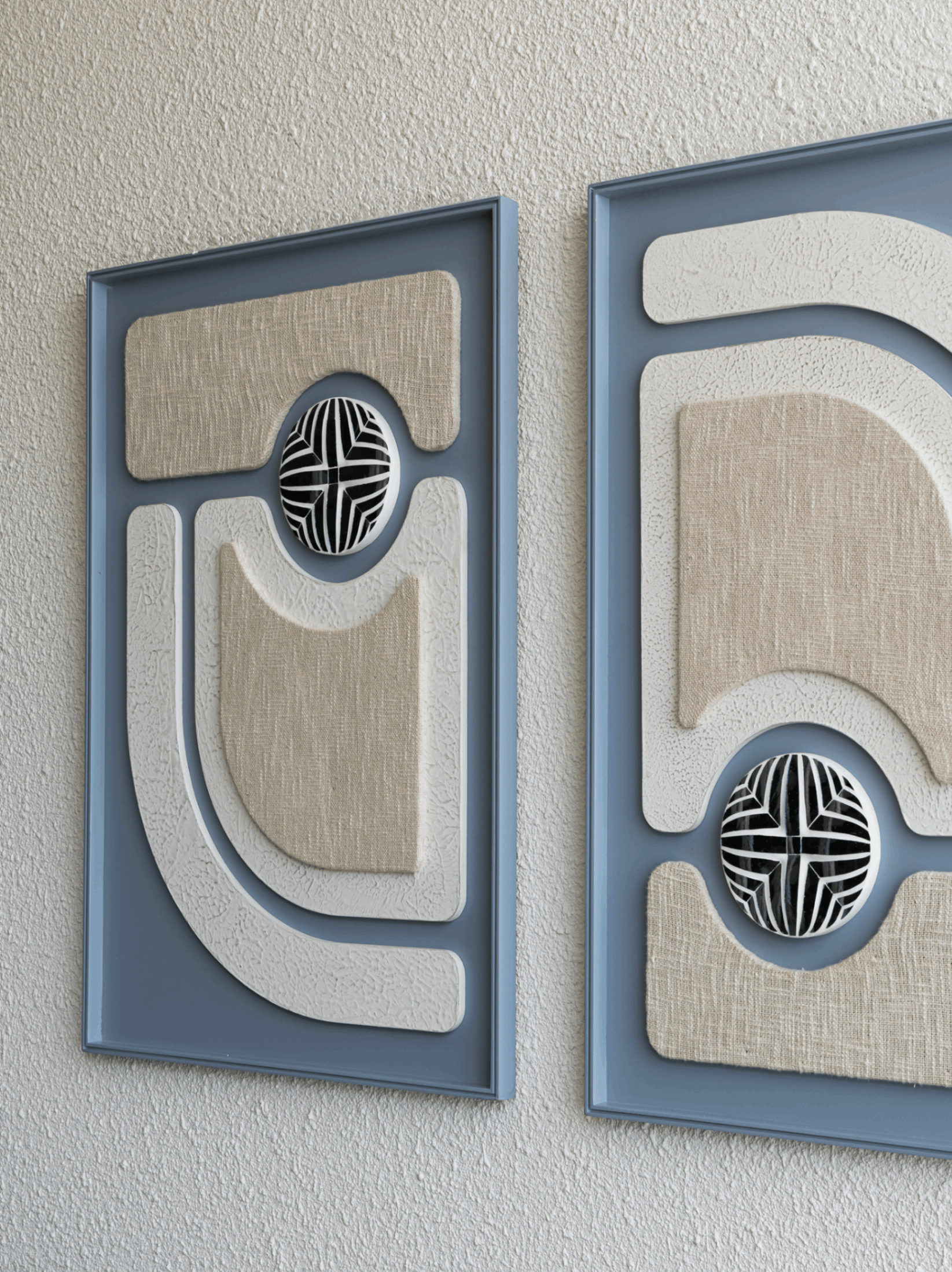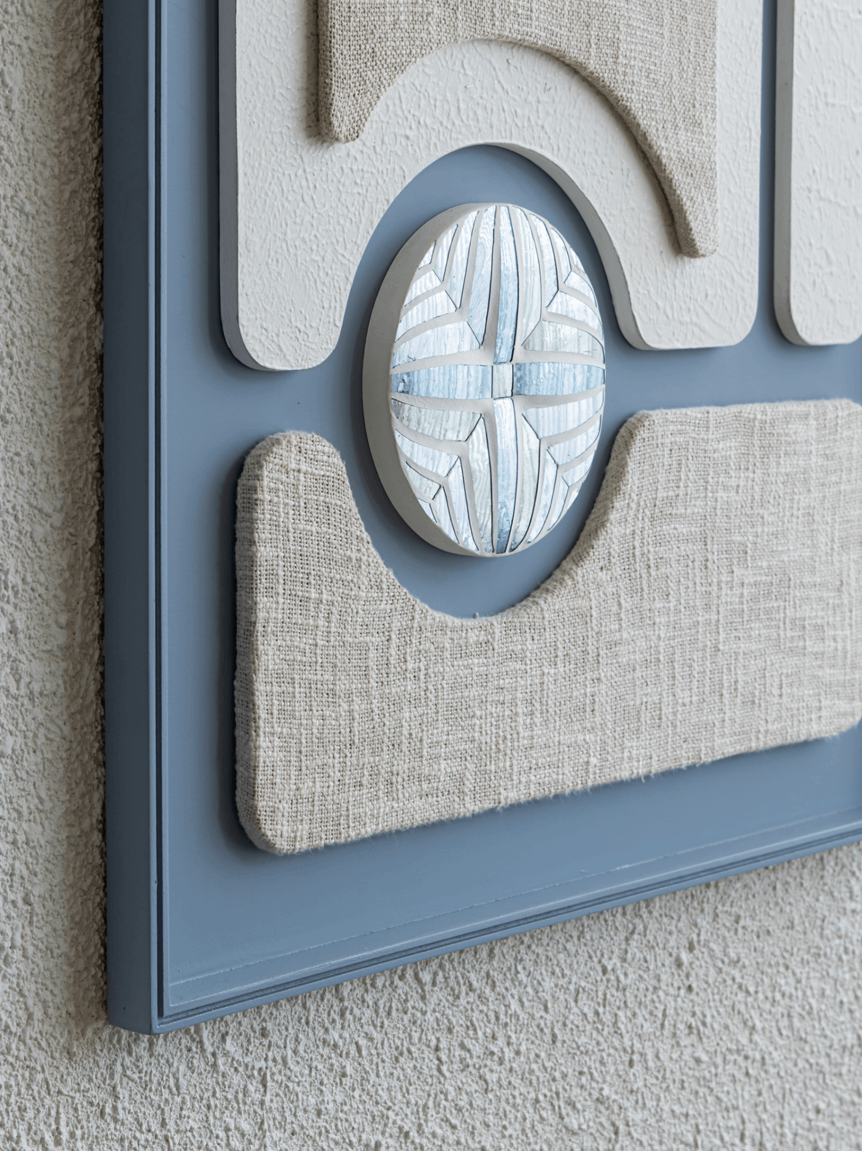 This collection showcases panels designed with rich fabric textures paired with thikri as the standout element. The contrast of soft textiles and reflective surfaces brings a balance of warmth and elegance. Clean geometric compositions and a refined modern appeal. Perfect for accent corners, stairway landings, passageways and statement backdrops.