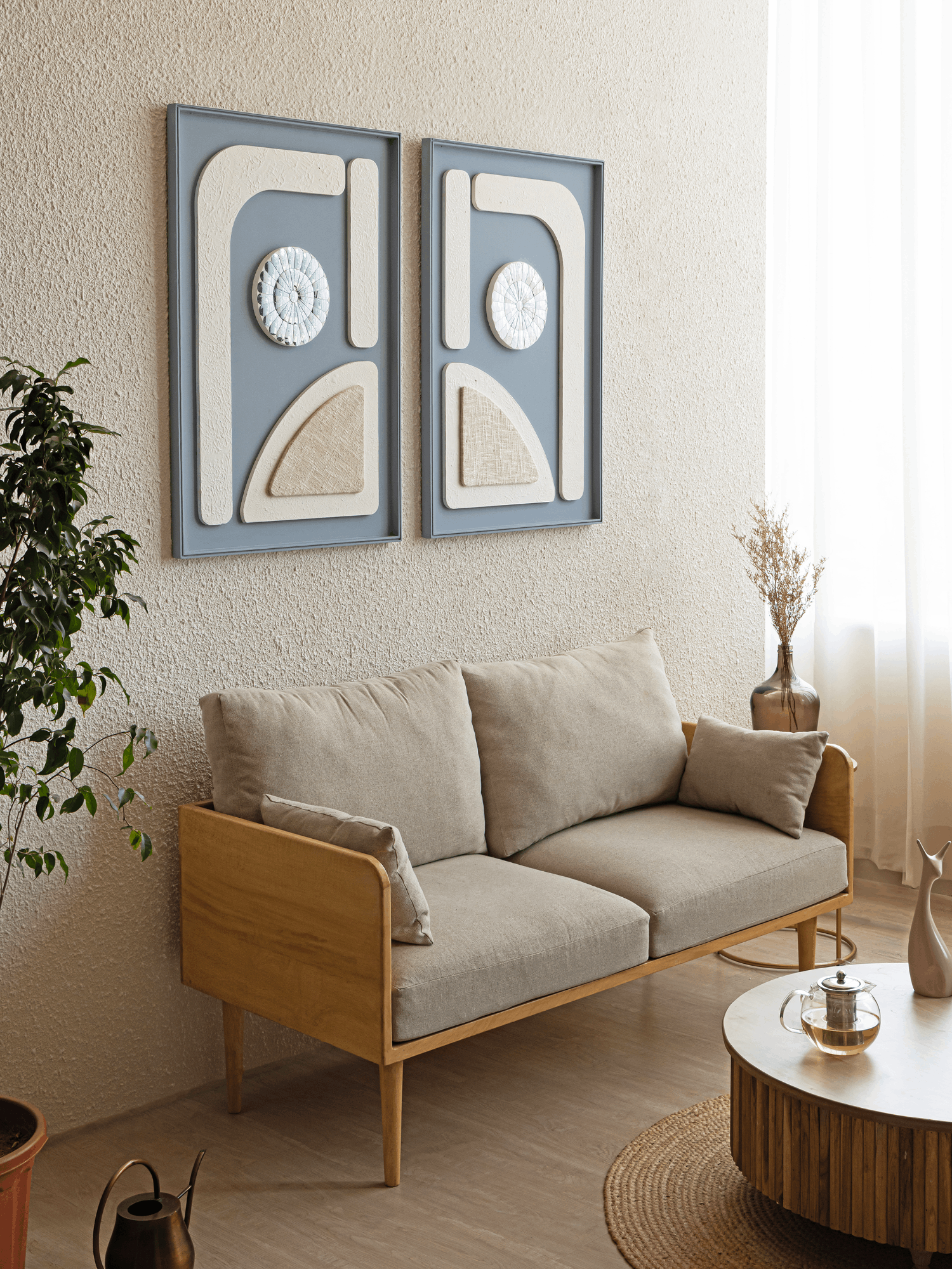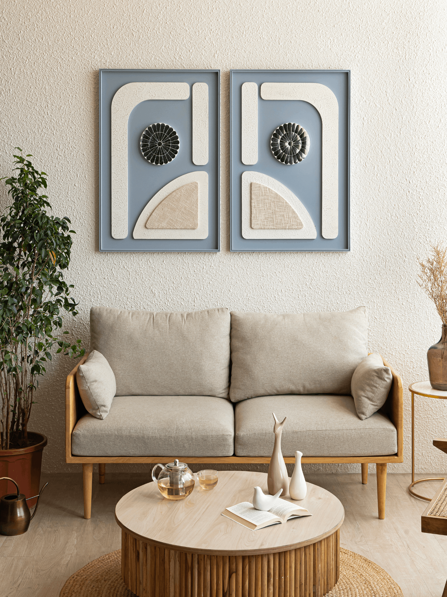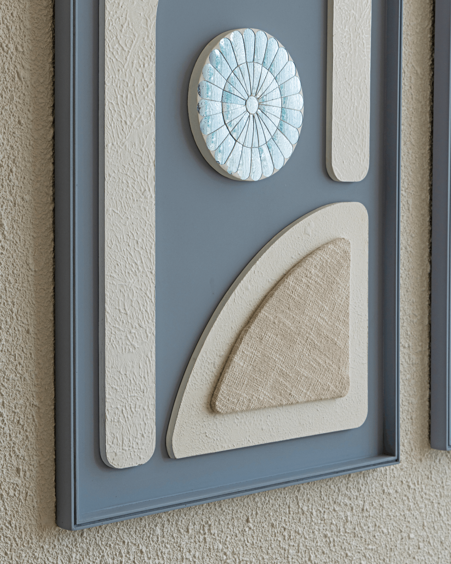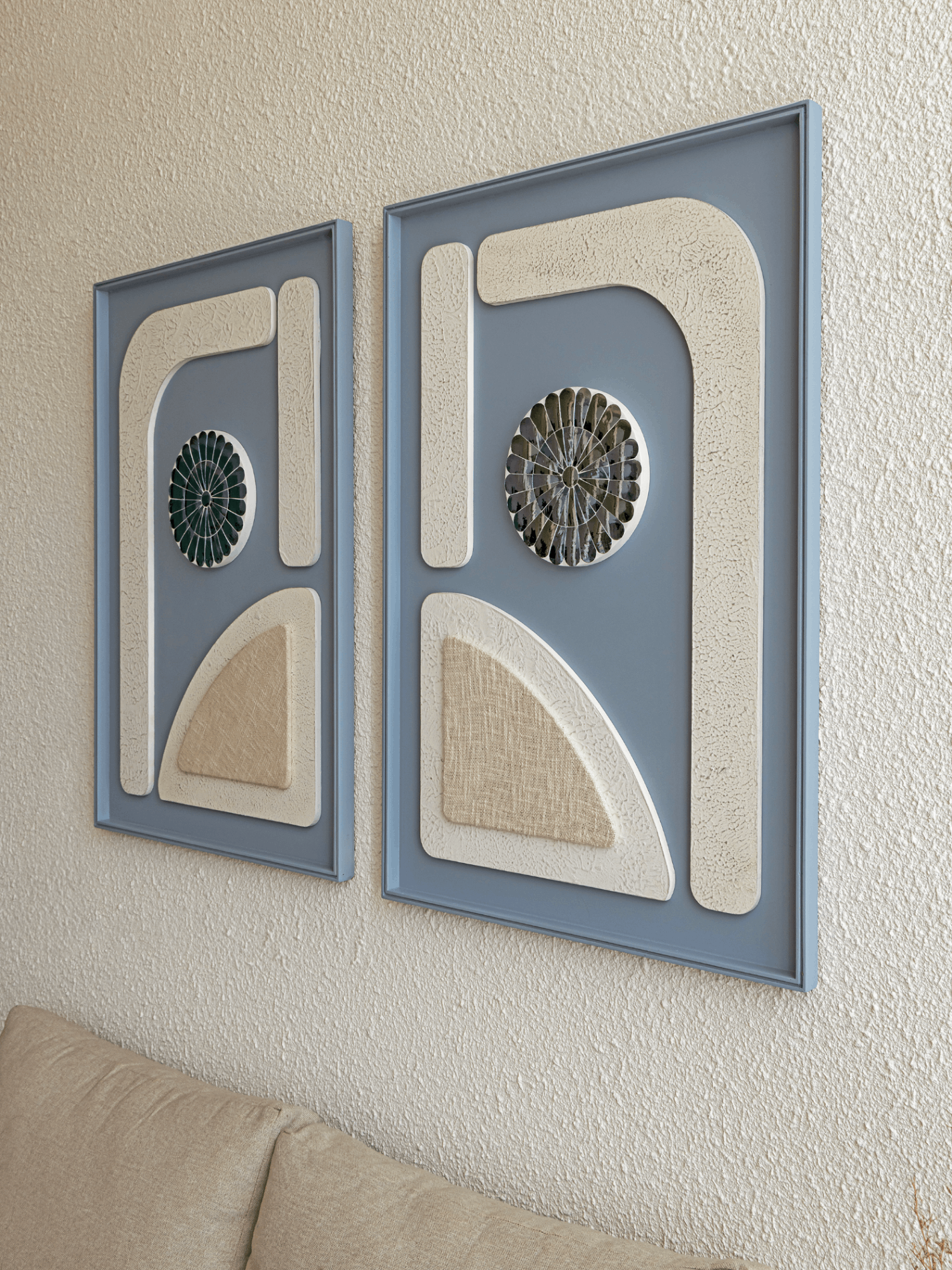 This collection showcases panels designed with rich fabric textures paired with thikri as the standout element. The contrast of soft textiles and reflective surfaces brings a balance of warmth and elegance. Clean geometric compositions and a refined modern appeal. Perfect for accent corners, stairway landings, passageways and statement backdrops.
