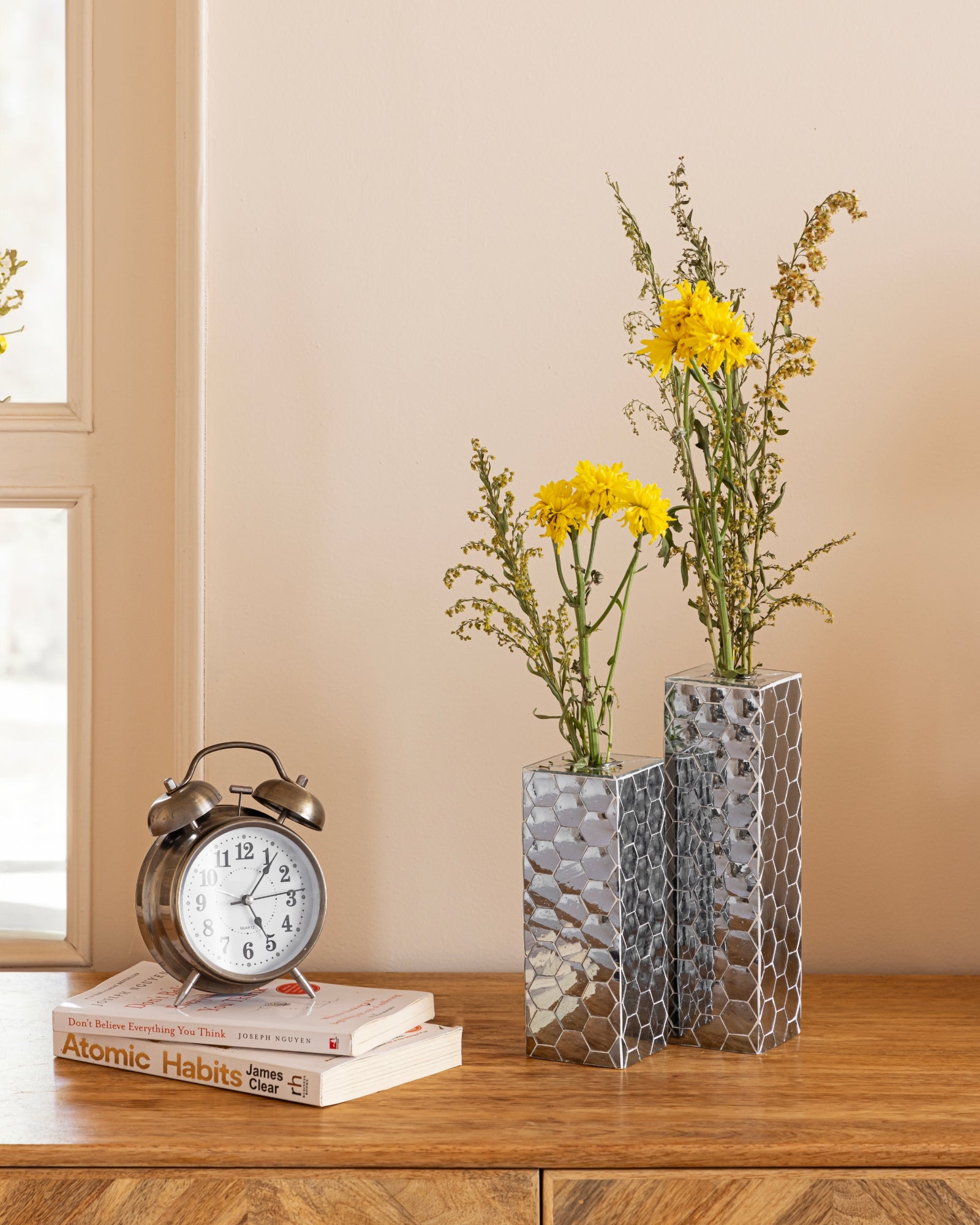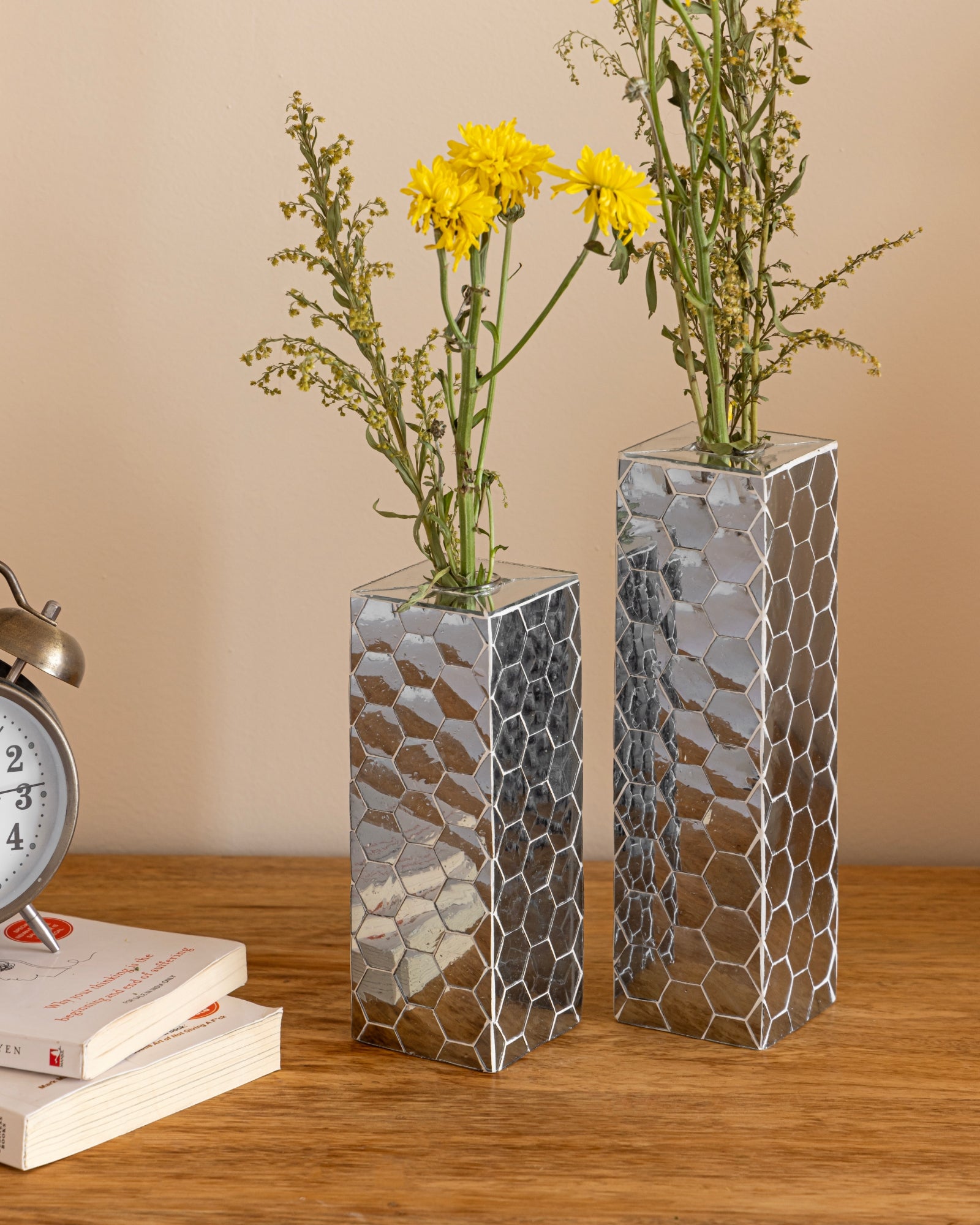 The clean geometry contrast s beautifully with the Irregularity of mirrored surfaces. These vases are quiet statements of culture,craft and contrast and glass tube inside makes it more practical and stanout in crowd. Perfect for Contemporary styling andcan fit on any console, bedside and any decorative space.