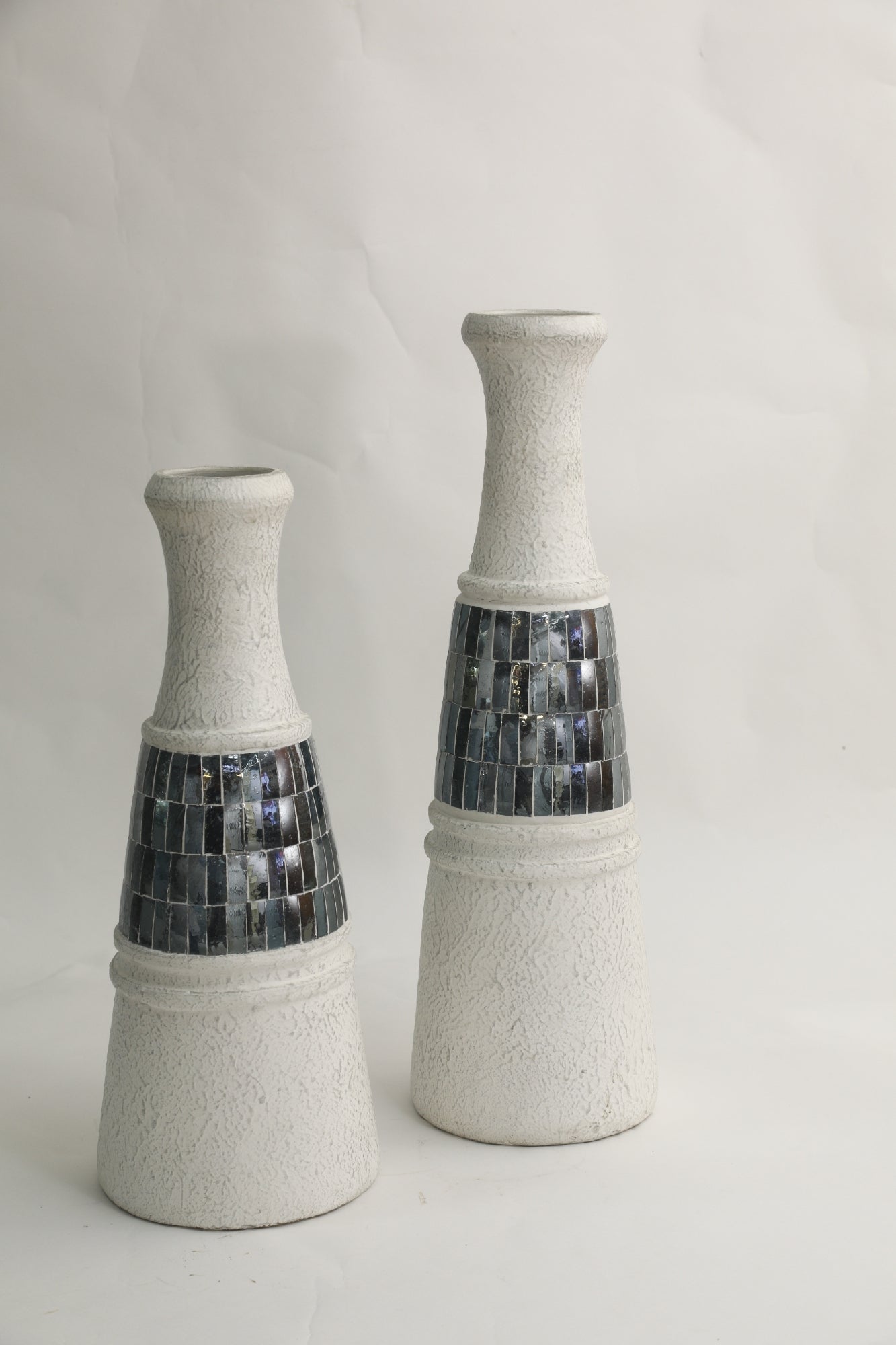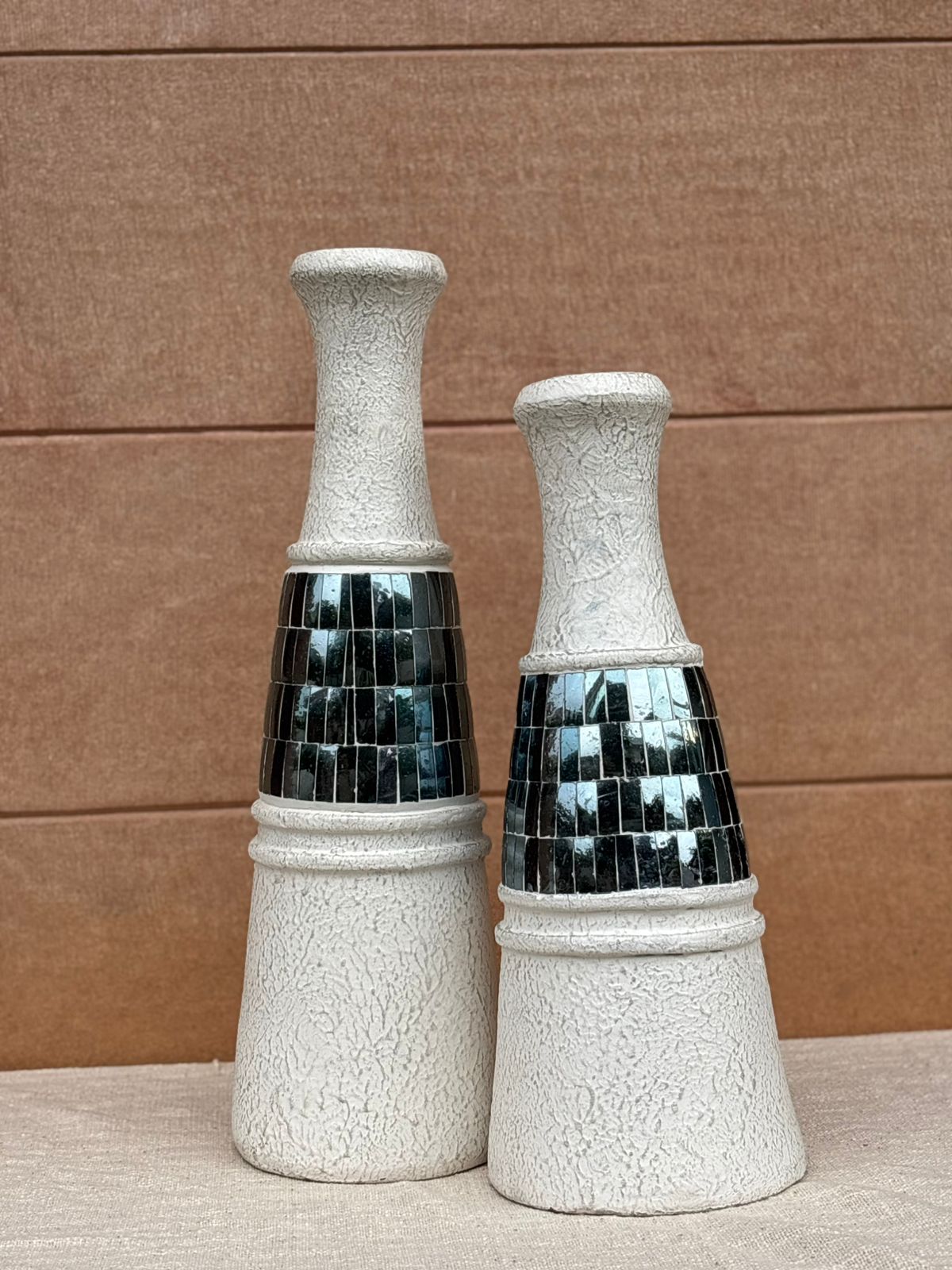 These vases combine the earthy warmth of hand-moulded terracotta with the reflective brilliance of Thikri (mirror inlay) work. Each vase is carefully shaped and fired by artisans, creating a tactile surface that carries the natural textures of clay. The embedded Thikri fragments catch the light, adding a play of sparkle and depth to the rustic materiality of terracotta.