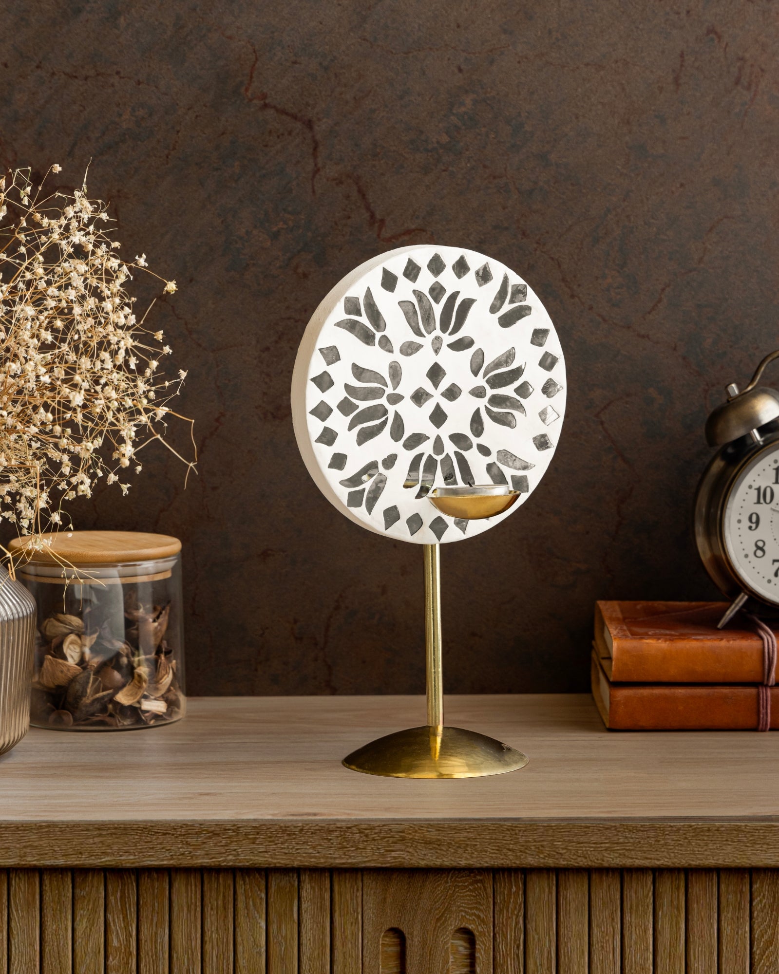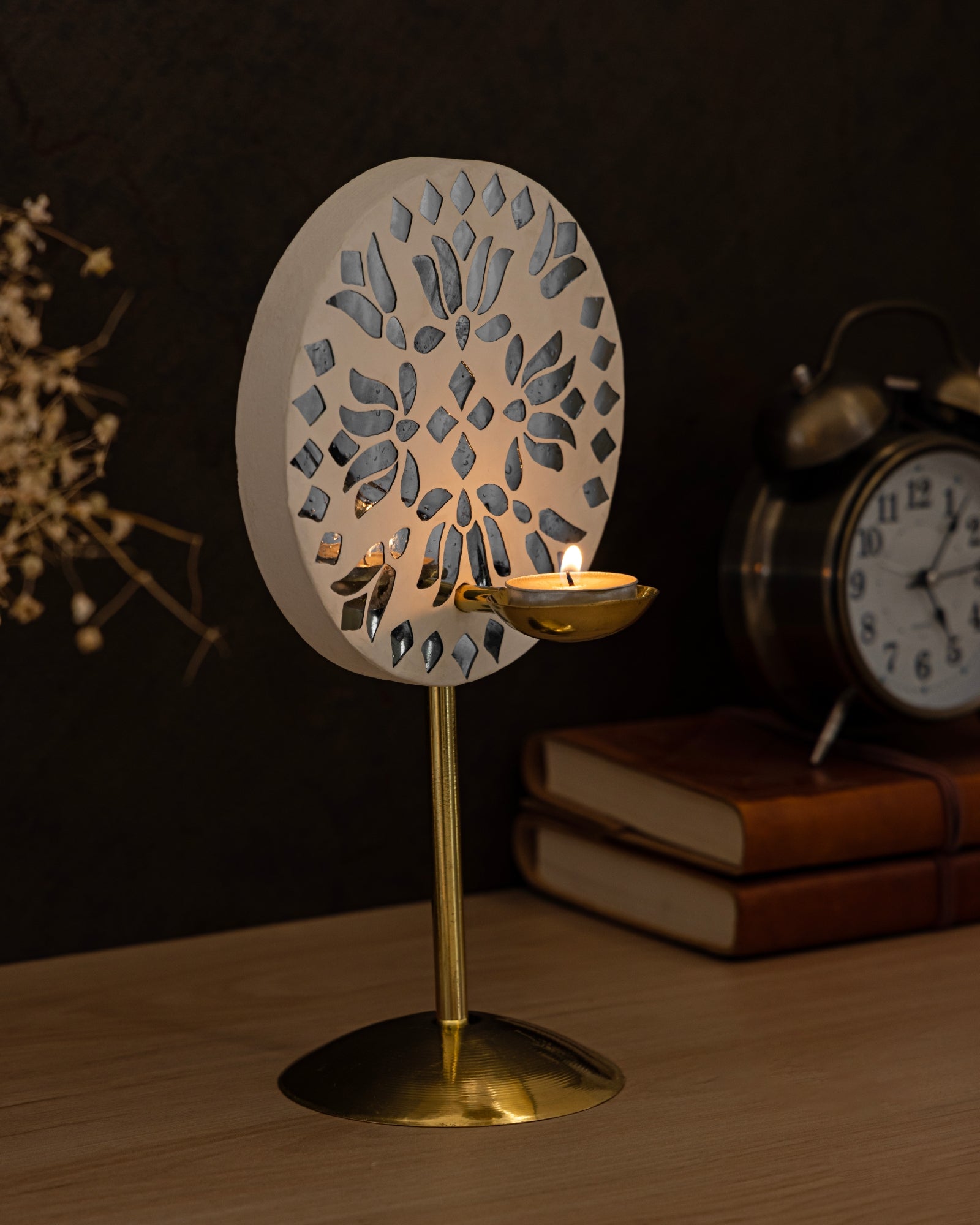 This collection of tea light holders brings a quiet brilliance to the spaces we live in crafted from hand finished brass and adorned with Thikri mirror inlay, Each piece reflects more than just light, a story impired by purity of flame and geometry of modern design Mirror plays a perfect role of reflection when candle is glowing and plays a perfect decor role for any space around.